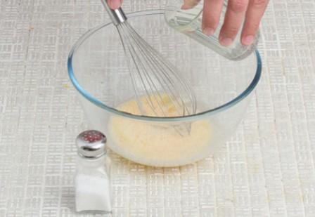 1 . Вымесите тесто: взбить яйца и соедините с водой. Всыпте просеянную муку, добавьте соль.
