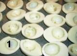 1 . Зразы можно готовить с разными начинками. В этом рецепте мы приготовим зразы, начиненные фаршированными яйцами. Сварим яйца "вкрутую" и, разрезав их пополам, выберем из них желтки.