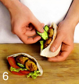 | Время приготовления : 1 час 10 минут + 12 часов | | Количество порций : 6 - 8 штук | Готовим фрикадельки из нута Вам понадобится : 150-200 гр. нута, 0,5 стакана муки, 1 большое яйцо, 1 небольшая луковица шалот, 200 гр. густого натурального йогурта, 4 зубчика чеснока, 1 большой пучок кинзы, цедра и сок половины лимона, щепотка кайенского перца, 2 ч. ложки зиры, растительное масло для фритюра, оливковое масло, 4 питы, помидоры, огурцы и салатные листья для гарнира  | 1 . Заранее, за 12-18 часов, замочите нут в большом количестве воды комнатной температуры. За это время можно воду сменить 1-2 раза. Откиньте на дуршлаг. Лук и 3 зубчика чеснока очистите и нарежьте. Нут вместе с луком и чесноком измельчите в кухонном комбайне в мельчайшую крошку. |  | 2 . Добавьте 3 ст ложки муки, зиру, половину измельченной кинзы, перемешайте до однородности. Добавьте яйцо, соль и перец, еще раз вымесите. |  | 3 . Для заправки смешайте йогурт, оставшийся измельченный зубчик чеснока, оставшуюся половину измельченной кинзы, лимонный сок и цедру. Приправьте кайенским перцем и солью, поставьте в холодильник на 1 час. |  | 4 . Разогрейте масло для фритюра до 160 °С. Из получившейся массы мокрыми руками слепите фрикадельки размером с грецкий орех и чуть приплюсните. Обваляйте в оставшейся муке и обжаривайте порциями во фритюре до золотистой корочки с каждой стороны. Обсушите на бумажных полотенцах. |  | 5 . Питы прогрейте в духовке, отрежьте примерно треть, раскройте, смажьте оливковым маслом изнутри. |  | 6 . Тонко нарежьте помидоры и огурцы, нарвите салат руками. Положите внутрь каждой питы по 2-3 фалафеля, огурцы, помидоры и салат, щедро полейте йогуртовой заправкой и подавайте. | Предлагаем посмотреть рецепты на пасху: |