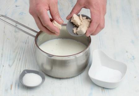 1 . Растворите дрожжи в теплом молоке с сахаром и солью. Дайте опаре подняться (около 20 минут).