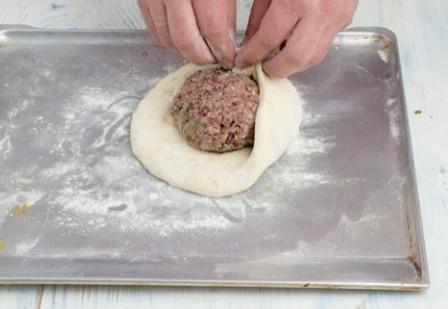 8 . Слегка раскатайте тесто в лепешку. В центр положите начинку, края защипните.