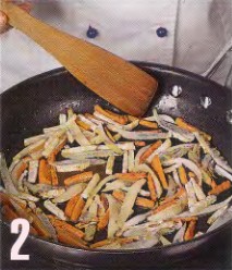 2 . Морковь, лук и корень сельдерея вымыть, очистить и нарежьте тонкой соломкой и обжарите в предварительно разогретом растительном масле до золотистого цвета.