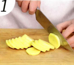| Время приготовления : 20 минут | | Количество порций : 4 -6 штук | Картофель с беконом Вам понадобится : 5-6 средних картофелин, 150 гр. тонких ломтиков бекона, 100 гр. чеддера, 5-7 стеблей зеленого лука, хлопья чили, оливковое масло, соль  | 1 . Тщательно вымойте картофель щеткой, по желанию очистите, обсушите и нарежьте кружочками толщиной 5 мм. Уложите на застеленный пергаментом противень (или два), смажьте оливковым маслом. Запекайте при 200 °С 15 минут. |  | 2 . Обжарьте ломтики бекона на большой разогретой сковороде до хруста с обеих сторон. Выложите на бумажные полотенца, наломайте небольшими кусочками. |  | 3 . Натрите сыр, мелко нарежьте зеленый лук, перемешайте лук, сыр и бекон. Посыпьте каждый картофельный кружок этой смесью, приправьте чили, запекайте еще 5 минут. Подавайте картофель горячим. | |