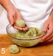 | Время приготовления : 1 час 40 минут | | Количество порций : 4-6 штук | картофельные котлетки Вам понадобится : 5 крупных картофелин крахмалистых сортов, 15-20 соленых крекеров, 1 средний пучок кинзы, 2 ст. ложки готового песто из базилика + еще для подачи, 1 ст. ложку семян кориандра, 1 ст. ложку черного перца горошком, крупная морская соль, топленое масло  | 1 . Картофель вымойте щеткой, уложите в большую кастрюлю, залейте кипящей водой почти доверху Доведите до кипения и варите до мягкости (картошка должна уже разваливаться), 40-45 минут. |  | 2 . Семена кориандра и перец положи-те на разогретую сухую сковородку и обжаривайте на среднем огне, потряхивая, 2 минуты. Затем положите в ступку, добавьте соль и разотрите довольно мелко. Переложите специи в другую посуду, оставив в ступке примерно 1 ч. ложку |  | 3 . Разломайте крекеры на маленькие кусочки и добавьте в ступку. Измельчите в крошку. |  | 4 . Готовый картофель откиньте на дуршлаг, обдайте холодной водой, очистите от кожуры и растолките толкушкой (не используйте блендер!). Добавьте растертые специи без крекеров, песто и 2-3 ст. ложки масла. Перемешайте все до однородности, остудите до такой температуры, чтобы массу можно было спокойно брать руками. |  | 5 . Снимите листики кинзы со стеблей (стебли не понадобятся) и крупно порубите ножом. Смешайте рубленую кинзу с картофельной массой. Смажьте руки растительным маслом и слепите из получившегося фарша котлетки размером с яйцо. |  | 6 . Разогрейте в небольшой глубокой сковороде масло слоем примерно 1.5 см. Обваливайте котлетки в смеси из крекеров со специями и кладите в масло. Жарьте небольшими порциями на сильном огне до золотистого цвета, по 2 минуты с каждой стороны. Готовые котлетки выкладывайте на бумажные полотенца, чтобы стек лишний жир Подавайте с песто. | |