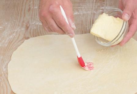 3 . Тонко раскатать тесто. Смажьте растопленным сливочным маслом. |