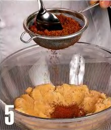 5 . В марципановую массу вмешайте какао-порошок так. чтобы у вас получился ровный шоколадный цвет. Раскатайте массу на присыпанной сахарной пудрой поверхности в круглый пласт толщиной 1-2 мм.