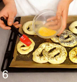 | Время приготовления : 2 часа 40 минут | | Количество порций : 16-32 штук | претцели Вам понадобится : 7 стаканов муки, 5 ч. ложек сухих дрожжей, 1 яйцо, минеральная вода с газом, сахар, соль, на выбор: тмин, зира, паприка, мак  | 1 . Смешайте дрожжи с 1 ст ложкой сахара, залейте 1 стаканом теплой (40-42 °С) воды, размешайте и оставьте на 10 минут. Смесь должна запузыриться. Просейте в миску муку с 1,5 ст. ложки соли, добавьте 1 ст ложку сахара. Влейте дрожжевую смесь и 2 стакана столовой минеральной воды с газом (чуть теплой). Мешайте деревянной ложкой до однородности. |  | 2 . Присыпьте мукой рабочую поверхность, выложите тесто и начинайте вымешивать, подсыпая муку (не больше 1 стакана). Вымешивайте 10 минут. Тесто должно остаться немного липким. Переложите его в чистую большую миску, накройте миску пленкой, поставьте в теплое место подниматься на 50-60 минут. |  | 3 . Поднявшееся тесто переложите на рабочую поверхность и разделите на 16 или 32 части, в зависимости от того, большие вы хотите сделать баранки или поменьше. Разомните один кусок между ладонями в длинную «колбаску», раскатайте его на рабочей поверхности, стараясь не присыпать мукой (можно делать это на пергаменте). Длина колбаски должна быть около 50 (или 25) см. |  | 4 . Выложите готовую колбаску полукругом, а потом перекрестите свободные концы и прилепите их к основанию баранки. Выложите баранку на смазанный маслом противень. Сделайте такие же колбаски из остального теста и слепите 16 (или 32) баранок. |  | 5 . Дайте баранкам постоять 15-20 минут. Тем временем наполните водой большую кастрюлю и доведите ее до кипения, добавьте 1 ст. ложку соли и 1 ч. ложку сахара. Руками или шумовкой берите по 1 большой баранке (или по 3 баранки поменьше) и опускайте в кипящую воду. Варите на сильном огне, пока они не «схватят 6 ся», 2-3 минуты. Готовые баранки выложите на решетку подсохнуть. |  | 6 . Выстелите противень смазанным маслом пергаментом, положите баранки. Смажьте каждую взбитым яйцом и присыпьте (на выбор) крупной солью, тмином, зирой, паприкой, кайенским перцем, карри или маком. Выпекайте при 210 °С до золотистого цвета, 25-35 минут. Слегка остудите. Подавайте теплыми с горчицей к холодному пиву. | |