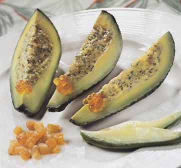 1 . Тщательно вымoйте авокадо и острвым ножом сделайте продольный надрез, чтобы была прорезана вся мякоть до косточки. Возмите плод двумя руками и повернуть обе половинки в разные стороны. Авокадо разделится на две части, в одной из которых останется косточка. Если авокадо спелое, косточка вынимается без всяких усилий. Чайной ложкой выньть часть мякоти авокадо. Половинки плода должны напоминать небольшие лодочки сбрызнете их лимонным соком и отложить.