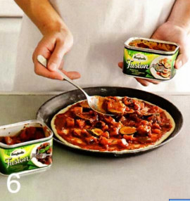 | Время приготовления : 30 минут + 2 часа на подъем теста | | Количество порций : 2 - 3 штуки | овощная пицца Вам понадобится : Для теста : 400 гр. муки, 7 гр. сухих дрожжей, 30 мл оливкового масла, 0,5 ч. ложки сахара, 1 ч. ложку соли Для начинки : 1 банка баклажанов по-тоскански, 1 банка кабачков по-тоскански, 2 банки рубленых помидоров в собственном соку (800 гр. ), 1 большой пучок руколы, 1 небольшой пучок базилика, оливковое масло  | 1 . В 250 мл теплой (38-40 °С) воды разведите соль, сахар, дрожжи и масло. Размешайте и дайте постоять 10 минут, чтобы дрожжи начали работать. |  | 2 . Постепенно всыпьте муку. Замесите тесто. Переложите тесто на присыпанную мукой рабочую поверхность и вымесите до эластичности. |  | 3 . Разделите тесто на 2-3 одинаковые части. Скатайте каждую порцию в шар, уложите на некотором расстоянии друг от друга на присыпанную мукой доску, сверху припылите мукой, накройте полотенцем и поставьте в теплое место на 1,5-2 часа. |  | 4 . Приготовьте томатный соус: смешайте в блендере помидоры вместе с соком, листья базилика (без стеблей), соль, сахар и взбейте все до однородности. Перелейте в сковороду и выпарьте до загустения на среднем огне, помешивая. Остудите соус. |  | 5 . Поднявшееся тесто раскатайте в форме круга толщиной 5-7 мм, смажьте его томатным соусом. Выложите в формы или на противни. Точно так же раскатайте и смажьте оставшееся тесто. |  | 6 . Выложите на тесто смесь кабачков и баклажанов по-тоскански и поставьте в разогретую до 220 °С духовку на 12-15 минут. Готовую пиццу посыпьте руколой и сбрызните оливковым маслом. | |