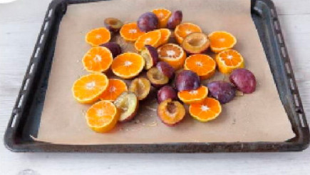 4. Увеличьте температуру до 190°С. Нарежьте мандарины толстыми кружочками, сливы крупными дольками. Уложите мандарины и сливы на чистый противень в один слой, полейте медом и поставьте вместе с уткой [переверните ее грудкой вверх) допекаться на 25-30 минут