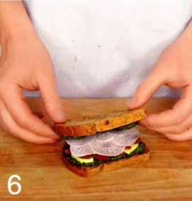 | Время приготовления : 15 минут | | Количество порций : 2 штуки | полезный сэндвич Вам понадобится : 4 куска ржаного хлеба с семечками и орехами, 1 большое очень спелое авокадо, 6 ломтиков вяленых помидоров, небольшой кусок дайкона, сок половины лайма, соль и свежемолотый черный перец по вкусу Для намазки: 1 небольшой пучок любой зелени (петрушка, кинза, укроп), 4 ст. ложки оливкового масла или масла от вяленых помидоров, 1 ч. ложку зеленого соуса ткемали, соль и свежемолотый черный перец по вкусу  | 1 . Для намазки мелко порубите зелень, положите в стакан погружного блендера, добавьте ткемали и оливковое масло, взбейте в пасту, приправьте солью и перцем. |  | 2 . Очистите дайкон от кожицы ножом для чистки овощей. Нарежьте его как можно более тонкими кружками. Чуть посолите и сбрызните соком лайма. |  | 3 . Очистите авокадо также ножом для чистки овощей. Разрежьте авокадо вдоль на четвертинки, удалите косточку. Нарежьте мякоть тонкими ломтиками. Посолите, сбрызните соком лайма. |  | 4 . Тонкими полосками нарежьте вяленые помидоры, предварительно немного обсушив их бумажным полотенцем от излишков масла. |  | 5 . Обжарьте куски хлеба в тостере или на сухой сковороде. Если хлеб очень свежий, этого можно не делать. Смажьте все куски с одной стороны намазкой из зелени. |  | 6 . Соберите сэндвич, выложив на половину кусков сначала авокадо, потом помидоры и дайкон. Накройте оставшимися кусками хлеба и подавайте. | |