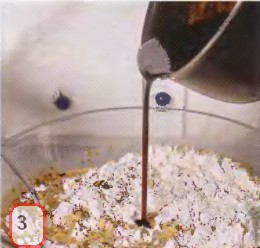 3 . Сделайте в муке углубление и влейте какао, пиво, растительное масло и патоку.