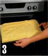 3 . Противень смажьте маргарином и нанесите полученную массу слоем 1 см. Духовку разогрейте до 250-270°С. Поставьте протвинь в духовку и запекайте в течение 10 минут до золотистого цвета. Готовое тесто остудите и вырежте из него два одинаковых прямоугольника