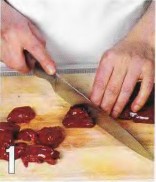 Нам понадобиться: 100 гр. листового салата,1 яблоко1 розовая луковица,1 лимон,15 гр. сливочного масла, 300 гр. куриной печенки, 100 гр. бекона, 4 ст. л. растительного масла,2 ст. л. фруктового уксуса,несколько ядрышек кедровыхорешко,всоль, перец по вкусу  | 1 . Куриную печенку тщательно вымыть, очистить от пленок и нарезать небольшими кусочками. |  | 2 . Бекон нарезать тонкими полосками. Вместо бекона можно использовать шпик или жирную копченую корейку.