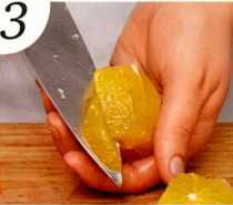 2 . Срежьте со всех апельсинов и с грейпфрута острым ножом кожуру так, чтобы была видна мякоть.