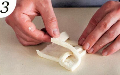 | 3 . У каждого прямоугольника прорежьте «рамки-уголки» шириной 1 см, не дорезая до двух противоположных углов по 2 см. Приподнимите «рамки», перекрестите и уложите на основание. Наколите основание вилкой, бортики не трогайте. |