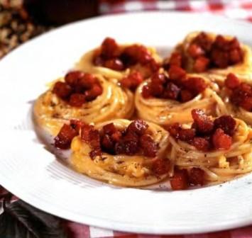 5 . Выложить спагетти на подогретые тарелки, сверху поместить поджаренныйбекон вместе с выделившимся сокоми жиром. Приправить черным перцеми немедленно подать. Словет: Если вам покажется, что блюдо получается слишком жирным, часть вытопившегося при жаренье жира можно будет слить.