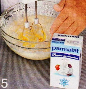 5 . Взбейтеь очень холодные сливки в стойкую пену, постепенно подсыпая сахарную пудру. Тонкой струйкой влейте шоколадную смесь, перемешивая лопаточкой.