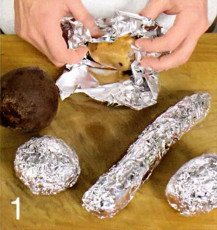 ,винегрет  с грибами рецепт,   1 . Помойте все овощи щеткой и заверните (каждый по отдельности) в фольгу довольно плотно. Положите на решетку в разогретую до 180 °С духовку, запекайте до мягкости, картофель и морковь по 30-40 минут, свеклу - 50-80 минут, в зависимости от размера.
