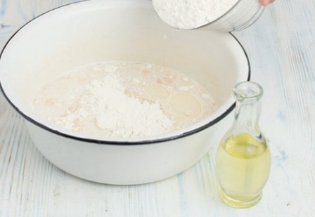 2 . Влить в муку растительное масло. Постепенно соединить муку и опару. Вымесите нежное тесто.