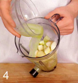 4 . Из сельдерея, имбиря и оставшихся яблок выжмите сок при помощи соковыжималки, добавьте в блендер.